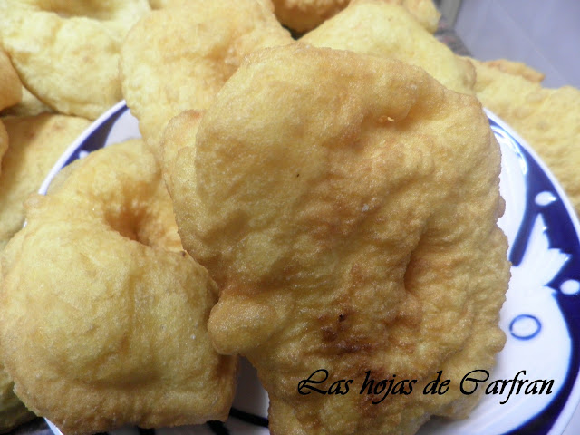 Metemos las manos en el agua de forma que estas se impregne y escurrimos ayudándonos de la dos manos para quitar el exceso. Cogemos un montón de masa y estiramos de forma que al ir estirando con los dedos índices abramos un agujero en medio y echamos a la sartén, la primera vez no es fácil, siempre empezando por la parte de la masa más lejana a ti. Con una espumadera echamos aceite por encima hasta que estén infladas, damos la vuelta y doramos por el otro lado.